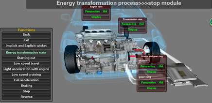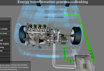 Provided a tablet, using three-dimensional interactive real-time operating system software demos Prius hybrid energy conversion pass teaching software, presentation software virtual disassembly. On the three-dimensional virtual reality software solution interface has the Prius sedan, the hybrid system can be clearly observed in the installation location in the car. You can interact with the operating system will be a hybrid zoom and 360 degree rotation. Observation of perspective or hide the internal workings of the hybrid system after obstruction. 17.2 In the three-dimensional virtual reality environment, Demos eight typical operating conditions, the energy transfer demonstration Prius Movement and mutual connection between the relationship line, and engine, MG1 motor, MG2 motors, planetary line between.